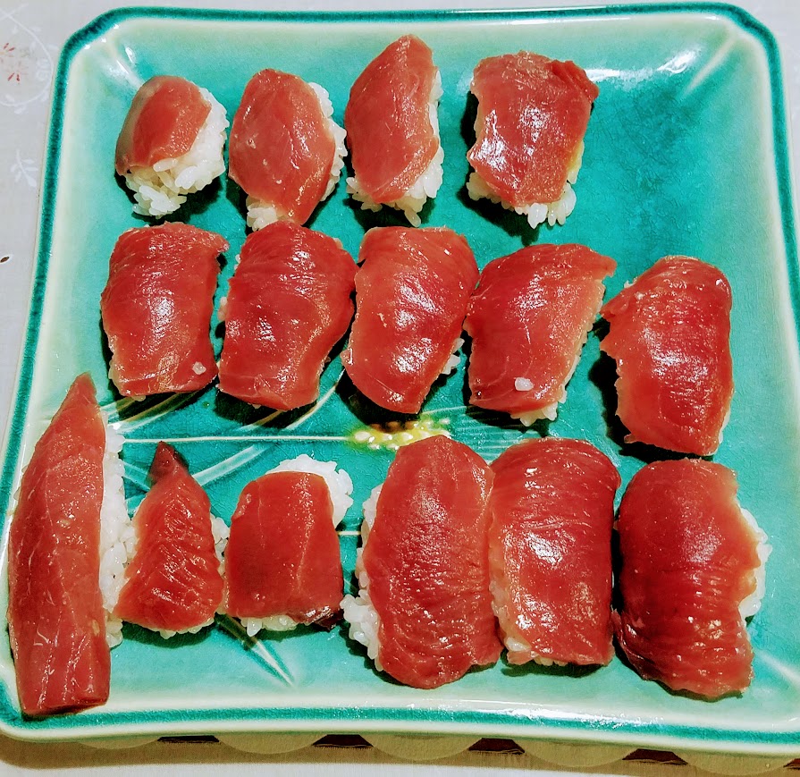 マグロをサクで買い、自分で刺身包丁で切り分け握った寿司。酢飯も自分で作る。