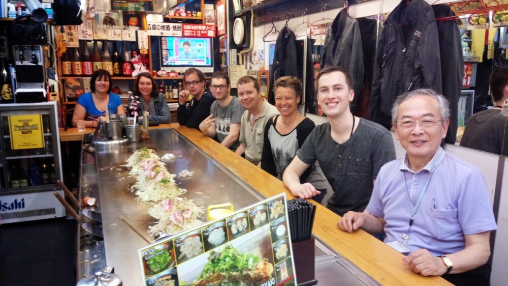 広島お好み焼き店「将ちゃん」にて。筆者の案内客。